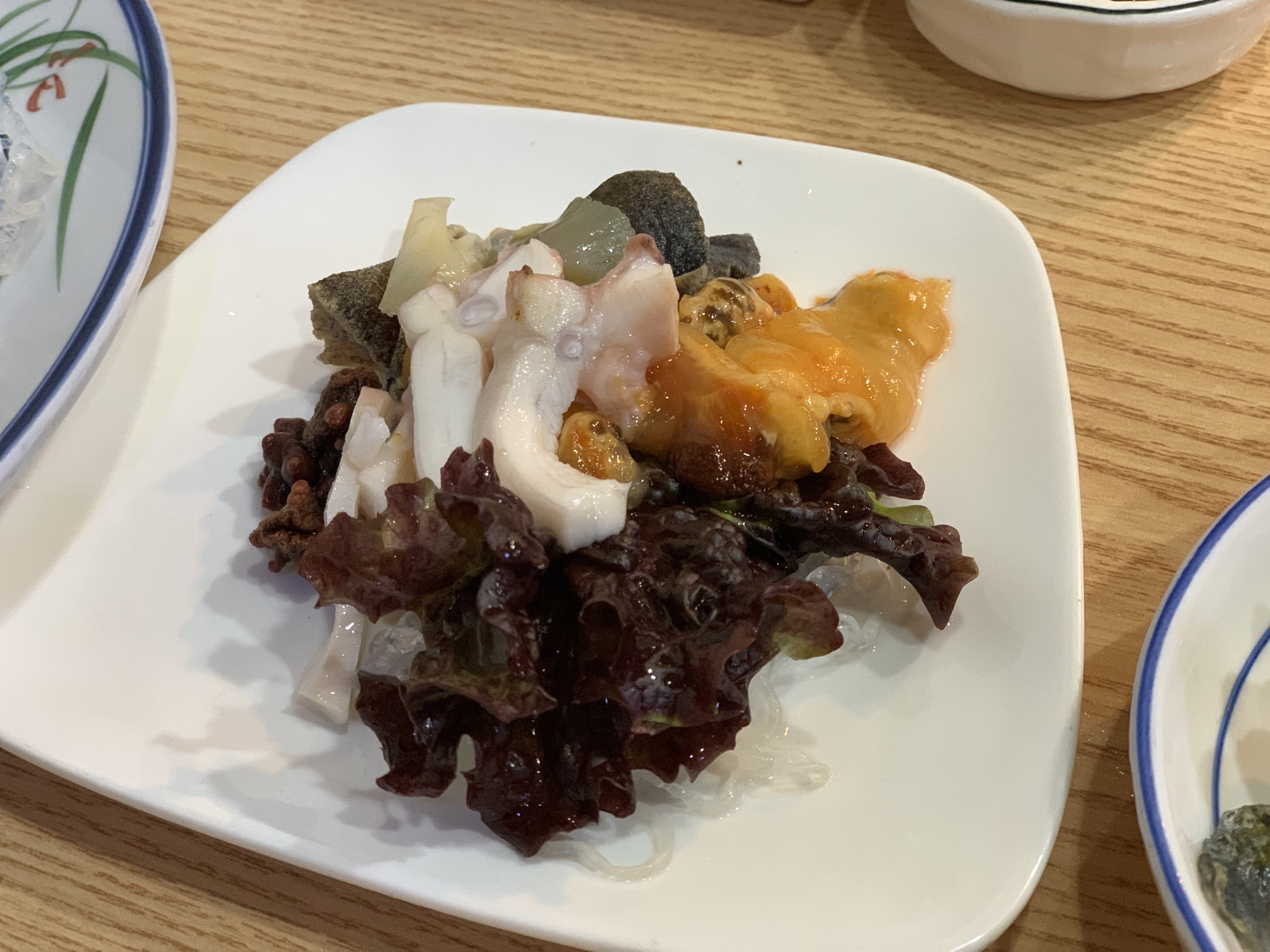 그리고 해산물 모둠이에요! 구성은 오징어, 멍게, 그리고 참소라에요. 오징어와 참소라 둘 다 잘 삶아졌고 멍게도 싱싱했어요!