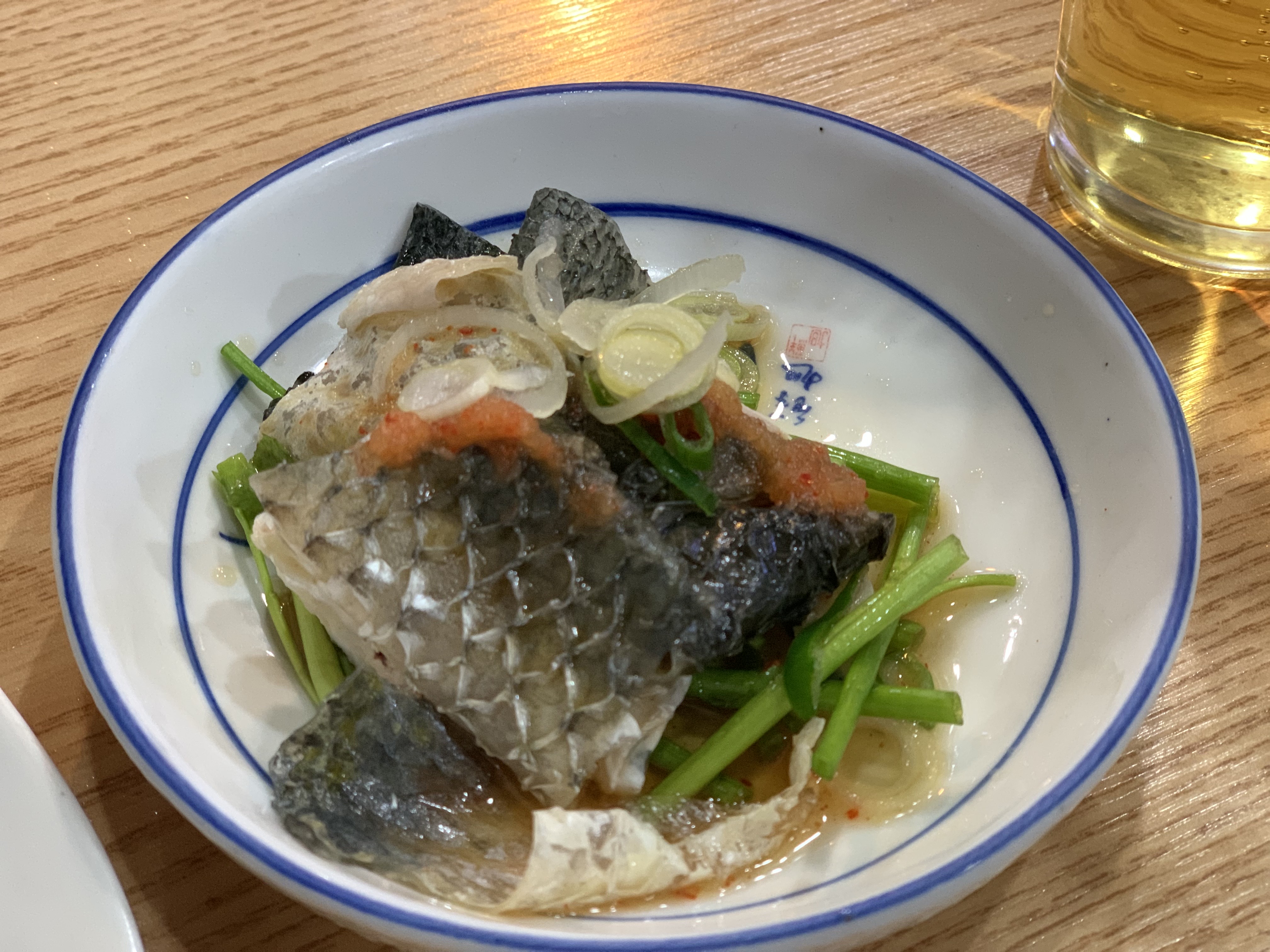 다음은 도미 껍데기예요. 미나리와 도미 껍데기를 냉채 스타일로 무쳐주셨어요. 양념 맛은 거의 없어서 미나리 향과 도미 식감으로 먹는 한 접시네요!