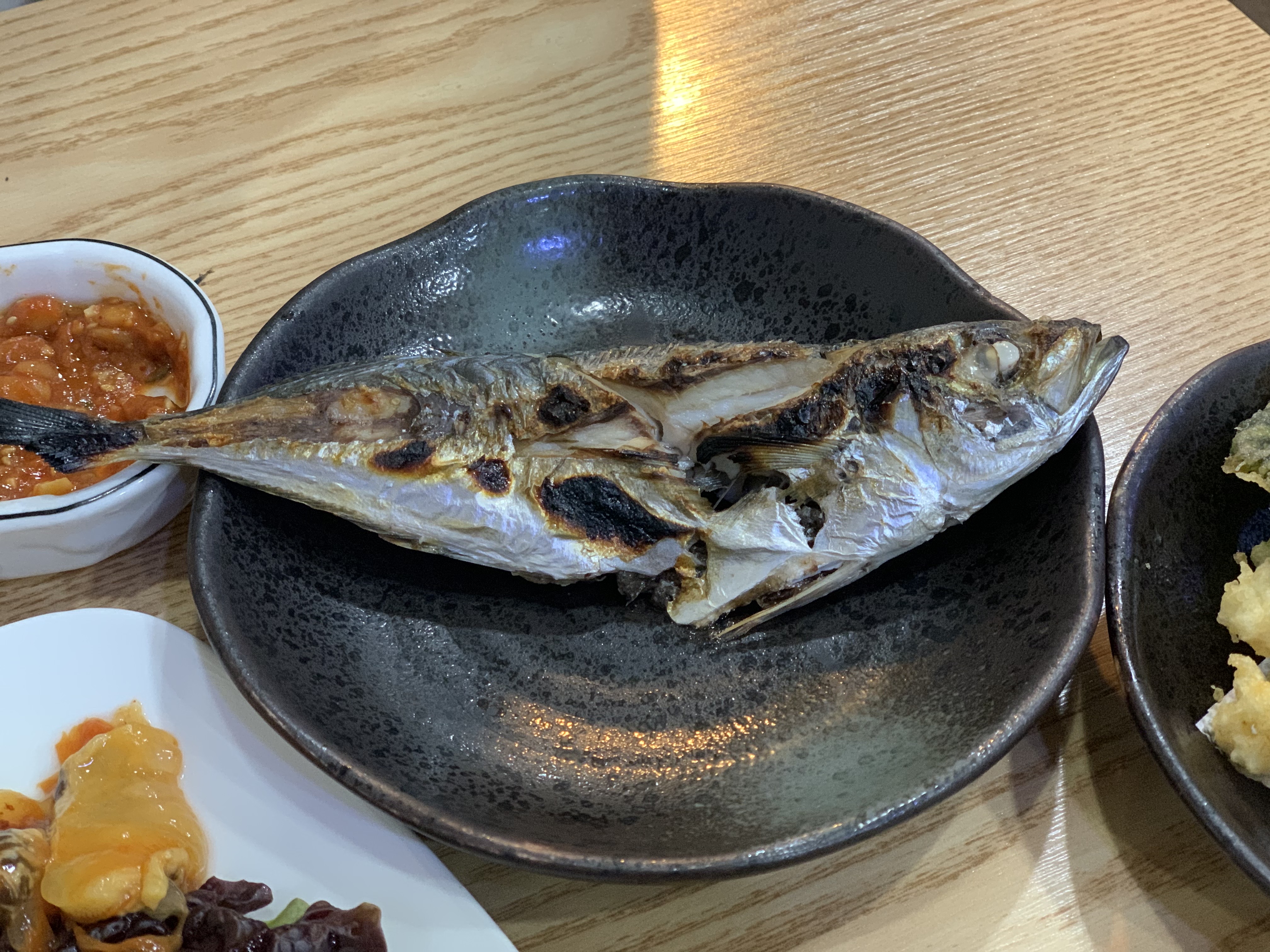 다음은 생선 구이예요! 아무리 먹어봐도 무슨 생선인지 감이 안 잡혀서 이모님께 여쭤보니 아지라고 하시네요! 전갱이를 일본어로 아지라고 합니다! 오마카세 집에 가시면 자주 접할 수 있는 횟감이에요.
